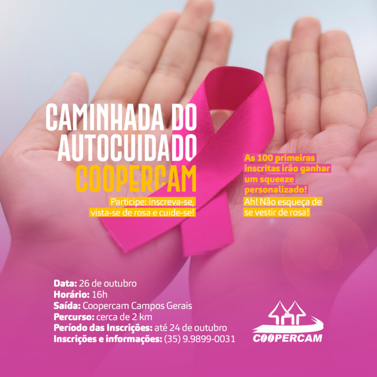 A caminhada está programada para o dia 26 de outubro, às 16h, e a concentração será em frente à loja matriz da Coopercam em Campos Gerais. Serão dois quilômetros de percurso e as 100 primeiras inscritas irão ganhar um squeeze personalizado. As inscrições podem ser feitas até dia 24 de outubro, por meio do WhatsApp (35) 9 9899-0031. “As 100 primeiras inscritas irão ganhar um squeeze personalizado da Coopercam e solicitamos, também, para que todas se vistam de rosa para a caminhada”, finaliza Corrêa.